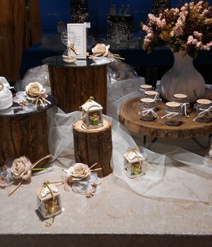 Sacchetti, scatoline, nastri, tulle, oggetti decorativi, vasetti in vetro.